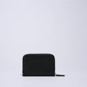 A compact wallet small enough to use as a coin purse or card case. Bills fit when folded into thirds. Inside, it holds up to five credit cards stacked together, plus two cards in each side pocket. The interior alone holds about 14 cards. The center pocket can also hold coins. The exterior back pocket holds credit cards and transportation IC cards, allowing them to function properly.