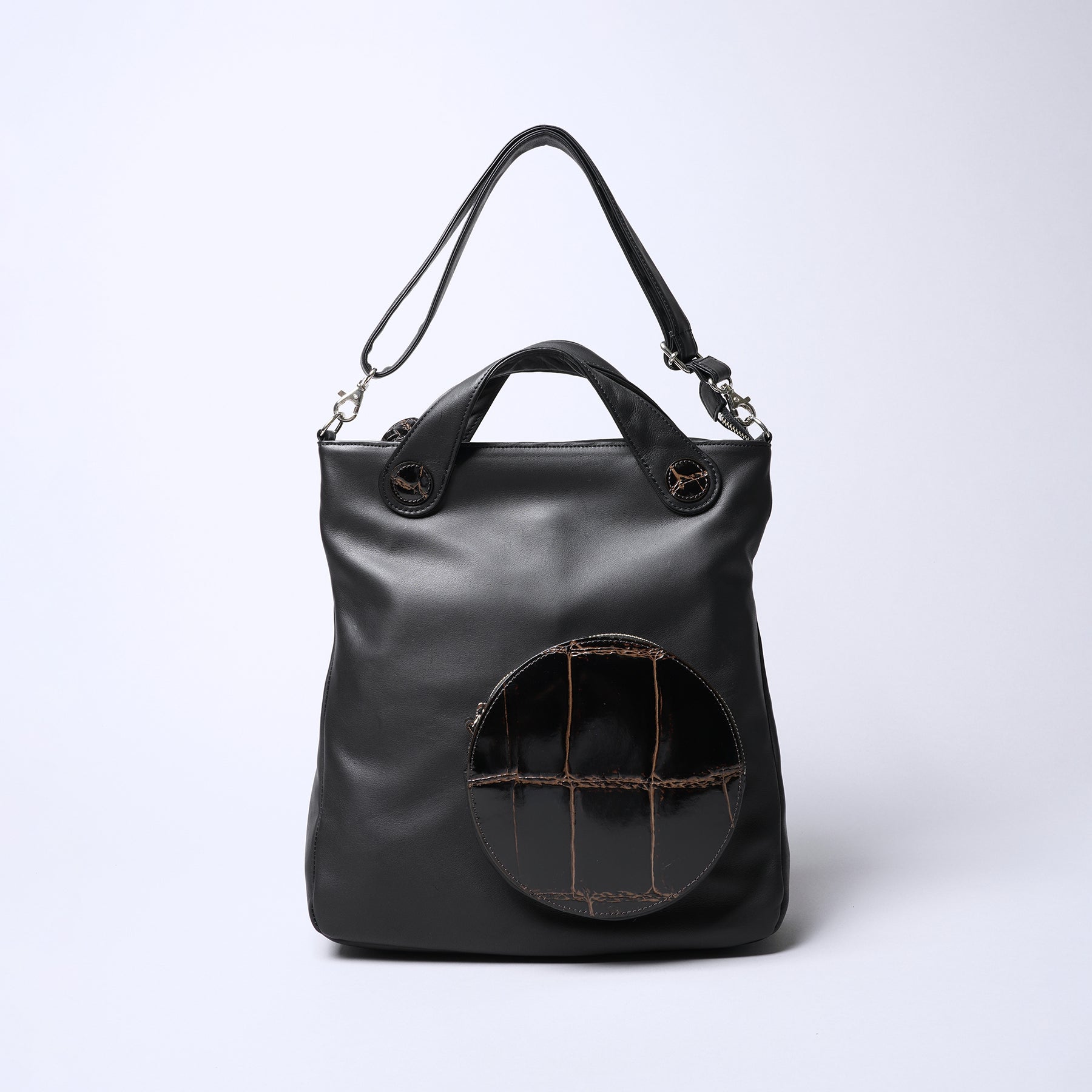 This series features a combination of premium natural oil-tanned leather and large crocodile-patterned pockets. By switching the shoulder strap, it can be used three ways: as a backpack, crossbody bag, or semi-shoulder bag.