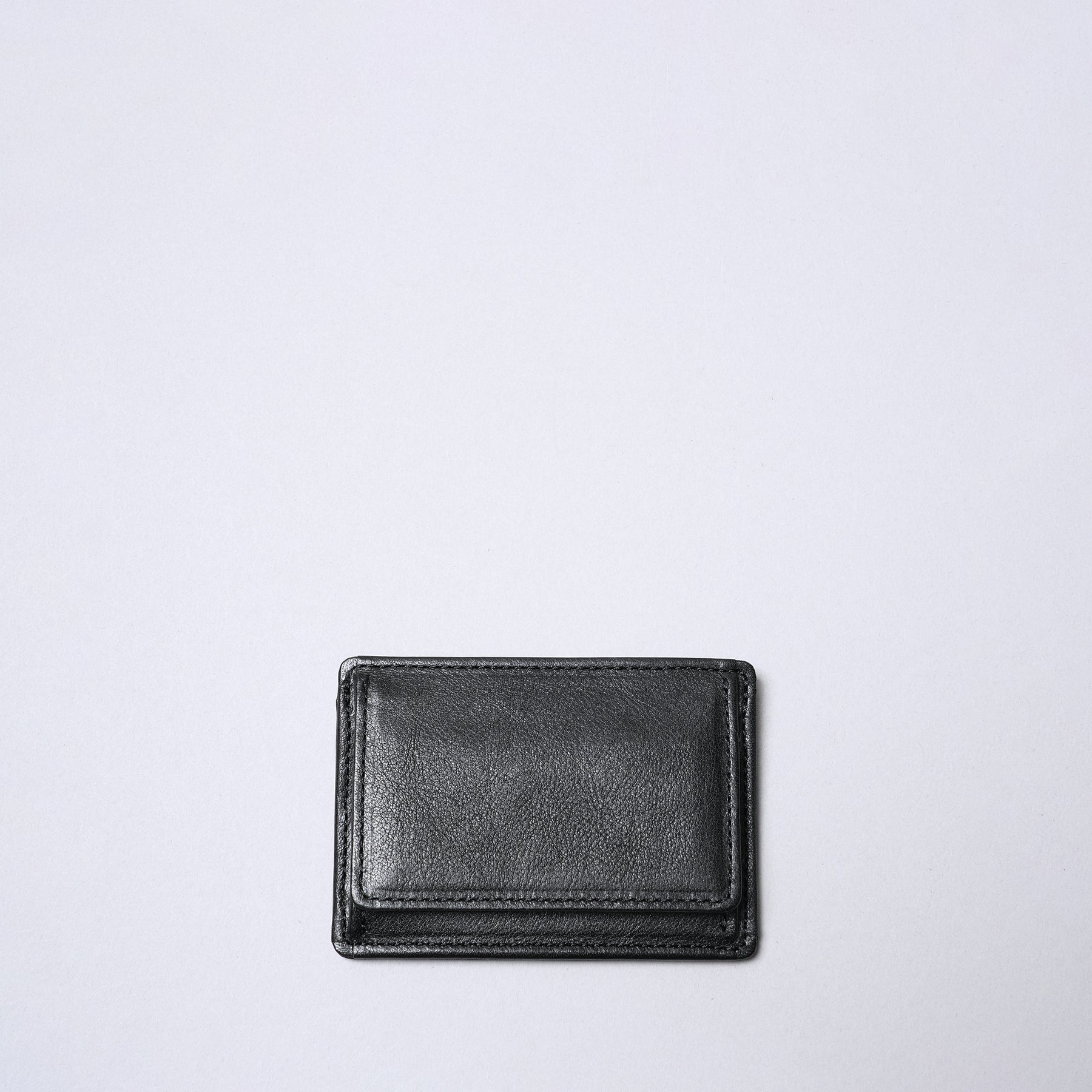 A wide coin case that accommodates cards. Its box gusset style features a gusset that expands when the flap is opened, making coins visible and easy to retrieve. The back includes a card pocket with a slit for viewing contents. Additionally, the central (slit) pocket can hold cards or folded bills (folded in four). This compact coin purse fits comfortably in your hand yet offers ample storage, making it an ideal minimalist wallet for those who prefer cashless payments.