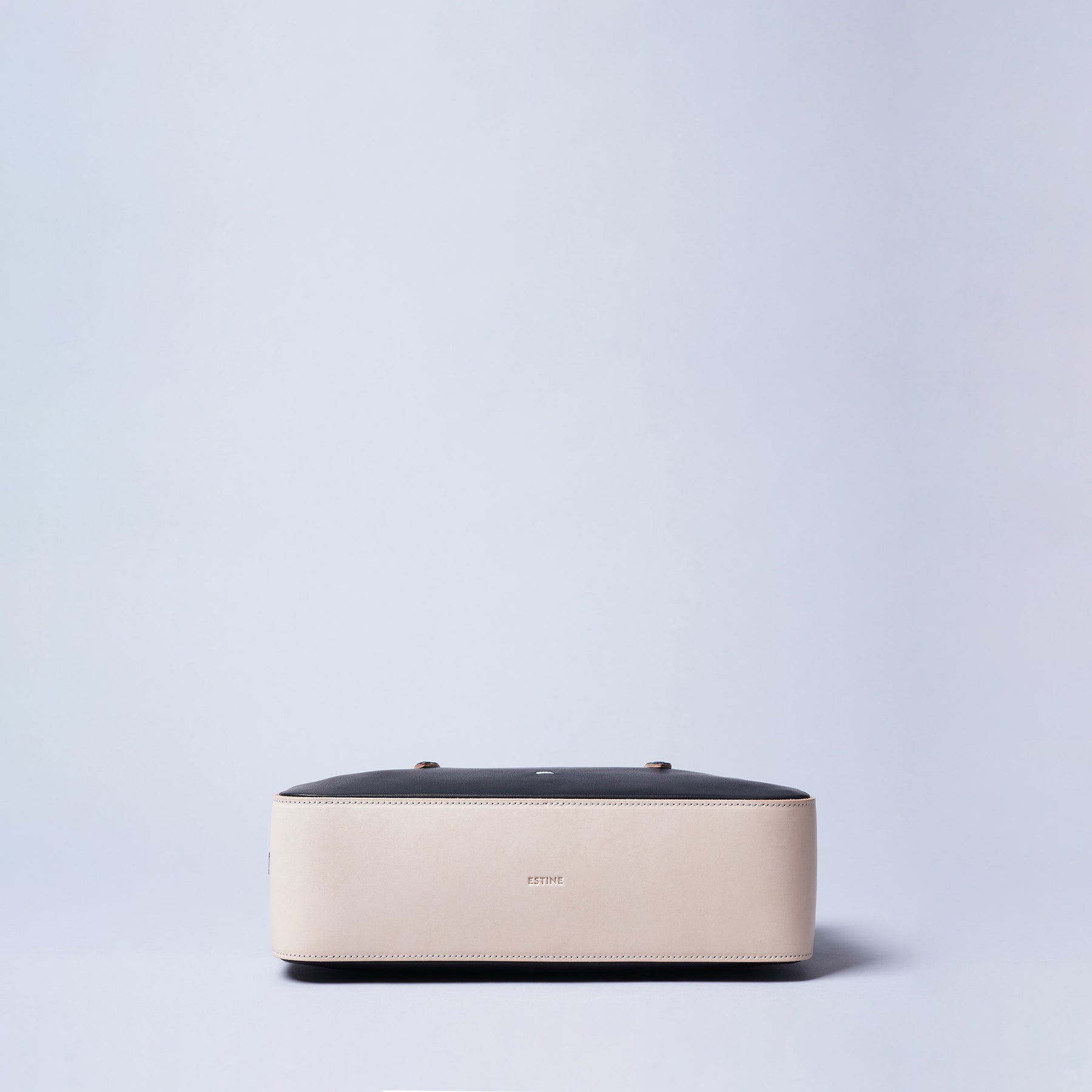 ブラックの素上げ革と白ヌメのコントラスト、構築的なフォルムが印象的なロジカルシリーズ。素上げ革は滑らかさと艶感が上がり、ヌメ革は色の変化が楽しめます。フロント部分のステッチは職人がひとつひとつ手かがりしています。特徴的な横長バッグは、ファッション性も高くモードな雰囲気に。見た目以上の収納力も魅力です。
