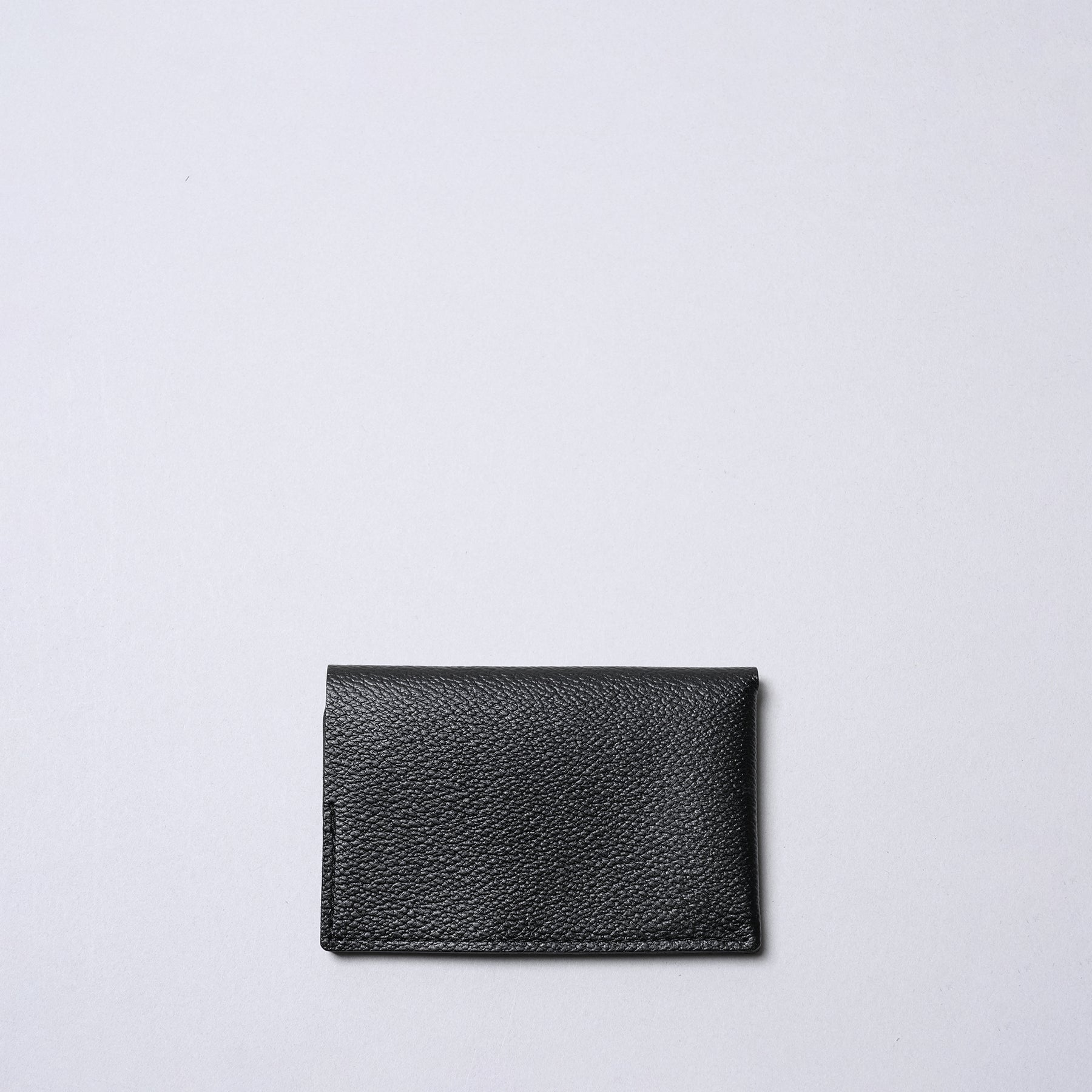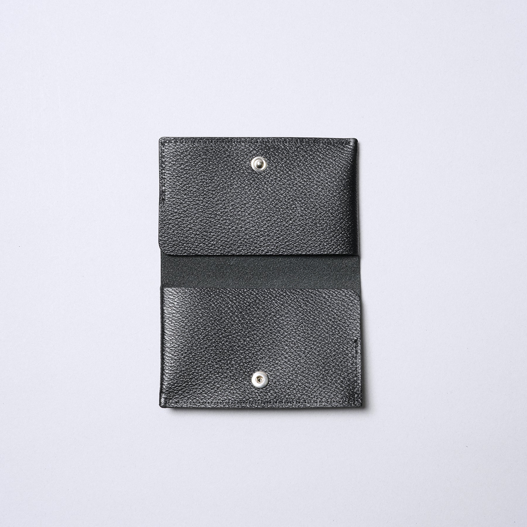 革をふわりと折り曲げることで、収納スペースをつくっています。マチは設けていませんが、それぞれの収納部におよそ15枚ずつ、計30枚の名刺やカードが収まります。また、折り曲げた部分が、蓋を閉じ合わせたときに重なると厚みが出てしまうため、縫製した薄い部分と、折り曲げた部分的とが互いちがいに重なるようにして厚みを均しています。かさばりにくさと、出し入れのしやすさを両立した、あたらしいデザインです。