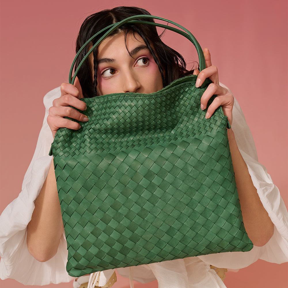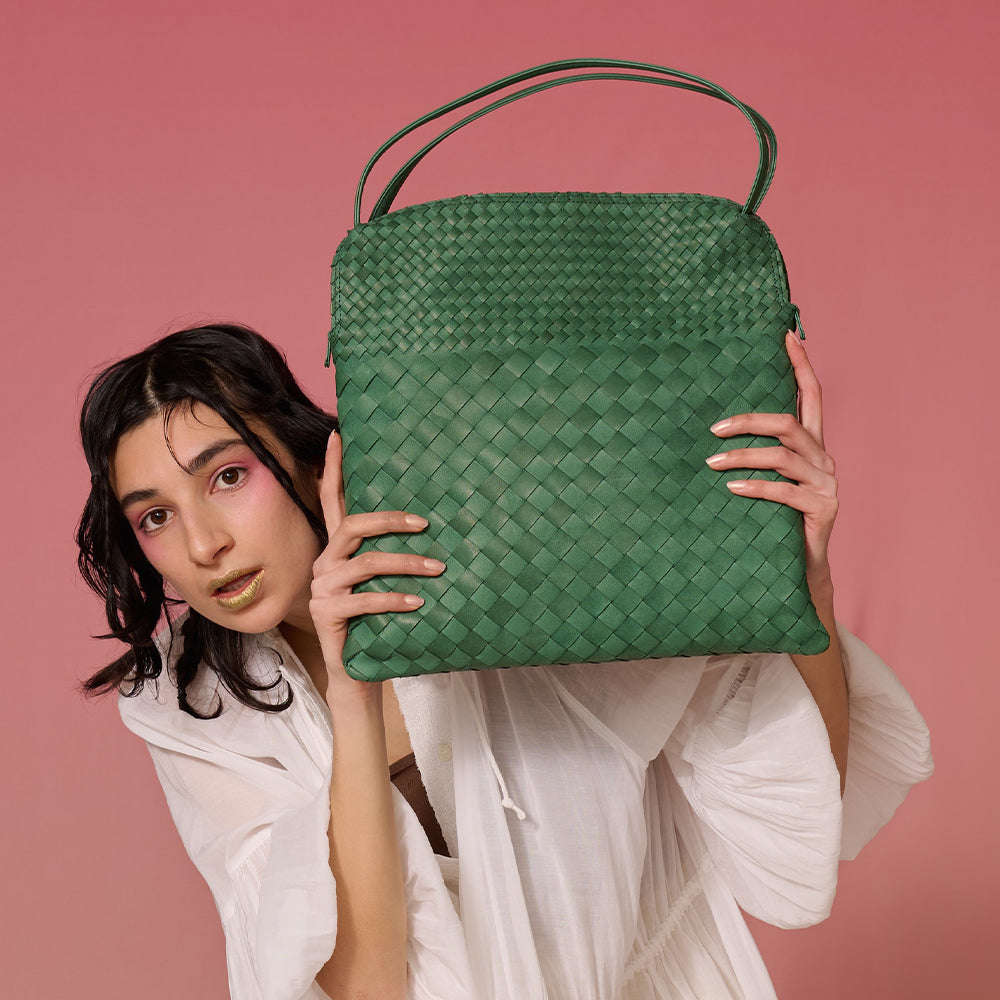 軽くしなやかな馬革を細く裁断し1本1本編み込んでいます。上下で細目と太目が継ぎ目無く切り変わるオリジナルメッシュ。使い込む程ツヤが増し経年変化も楽しめます。マチ幅を細くしたスリムなセミショルダーバッグ。