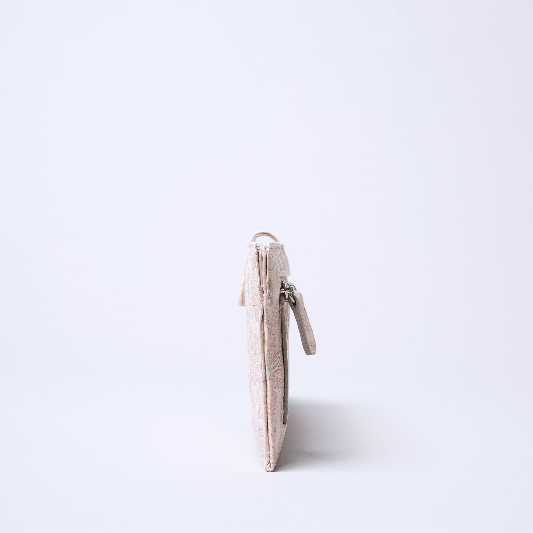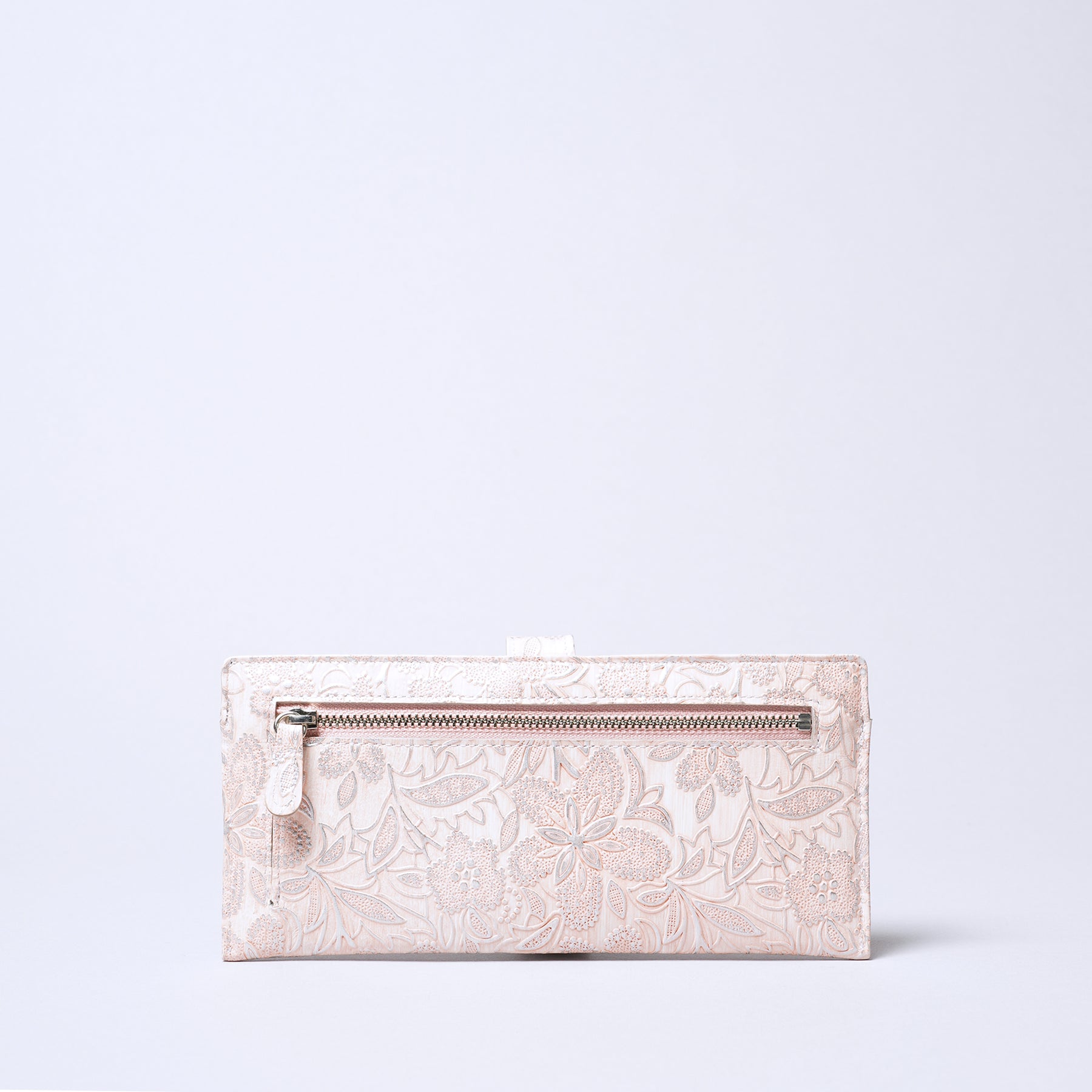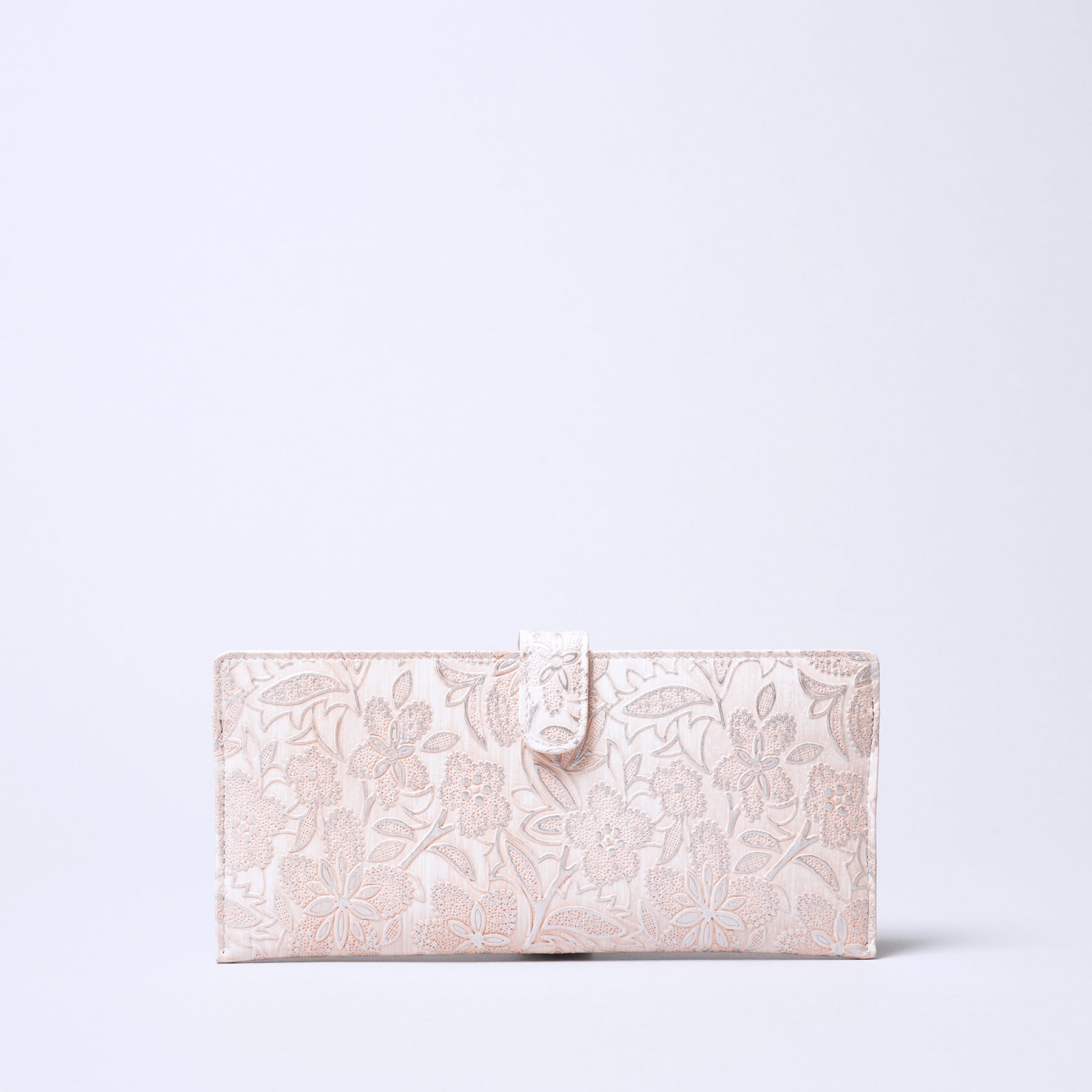 イタリア製の繊細でパール加工を施した型押し革を使用。女性らしい華やかな雰囲気の素材。日本の職人による丁寧なつくり。とても薄いスリムな作りですがお札、カード、小銭等収納可能。