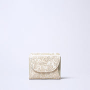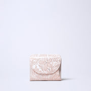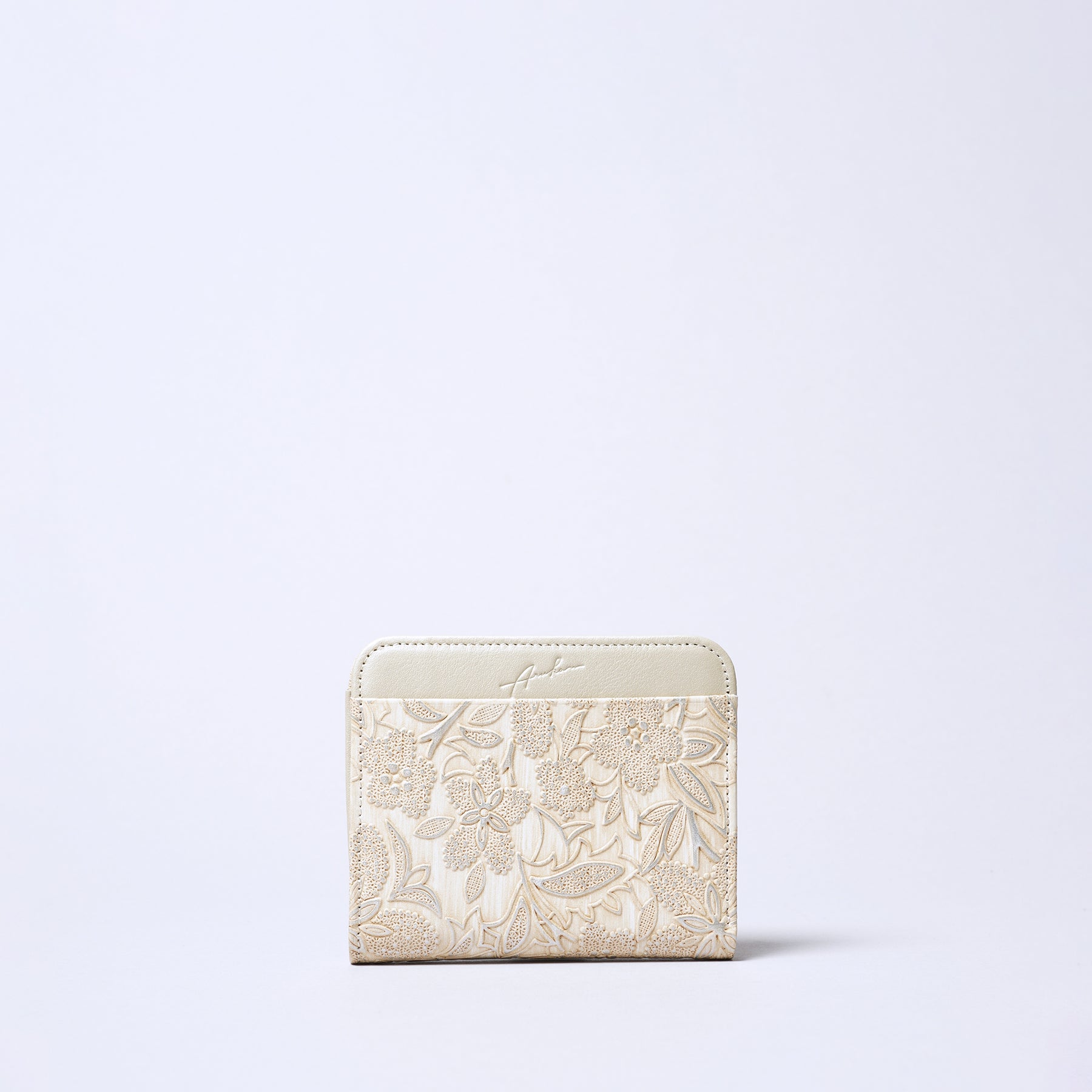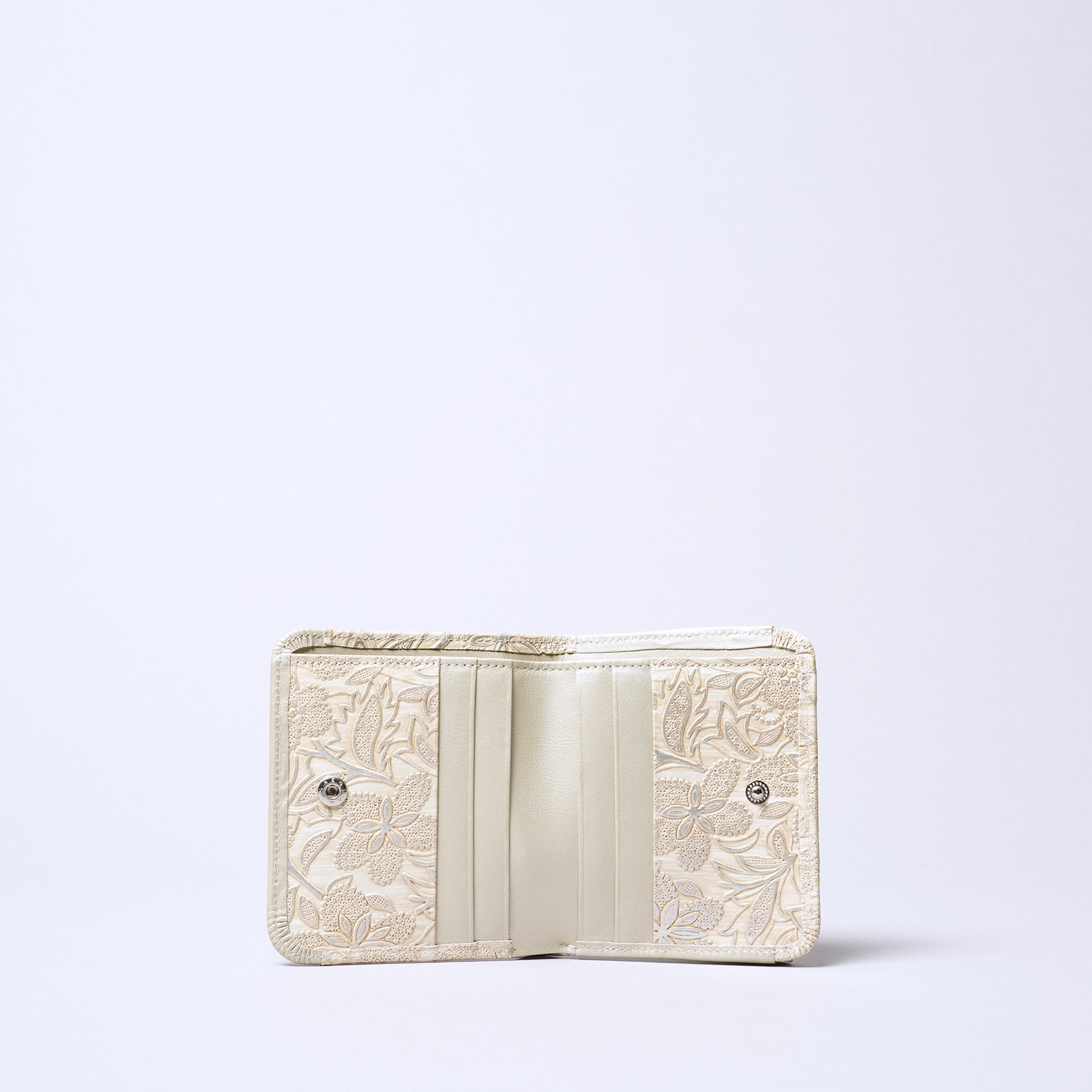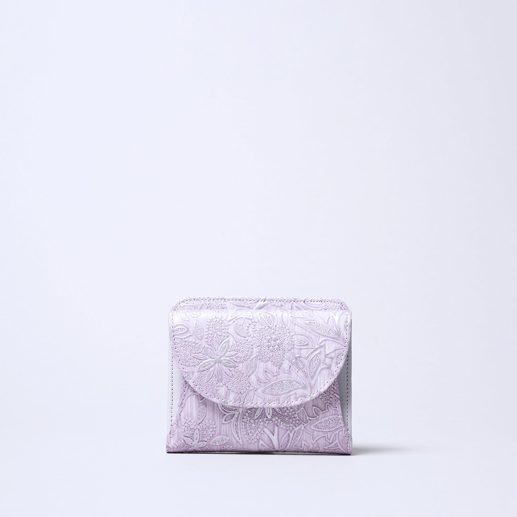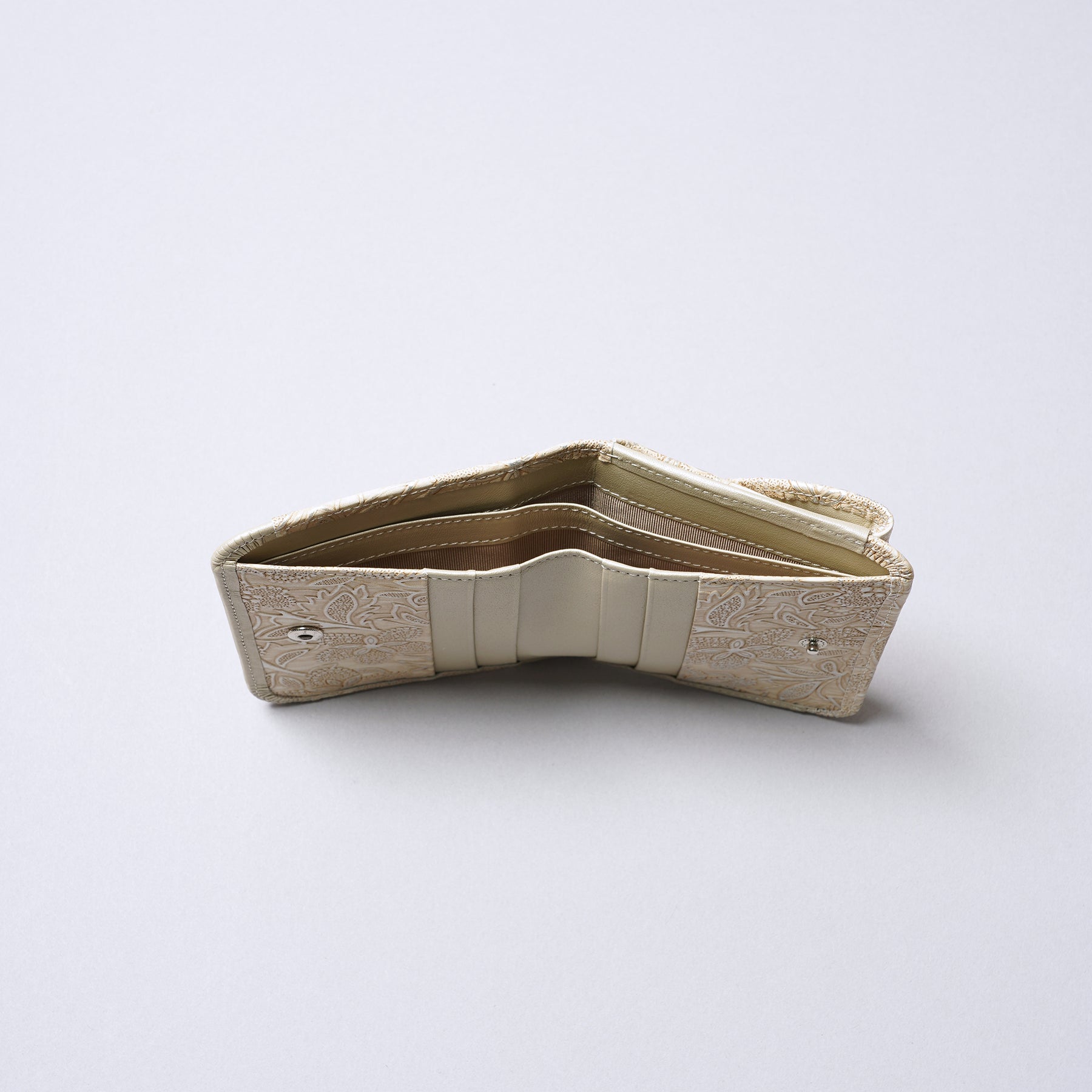 イタリア製の繊細でパール加工を施した型押し革を使用。女性らしい華やかな雰囲気の素材。日本の職人による丁寧なつくり。コンパクトな二つ折り財布。外側小銭入れはボックスタイプで見やすく取り出しやすい。