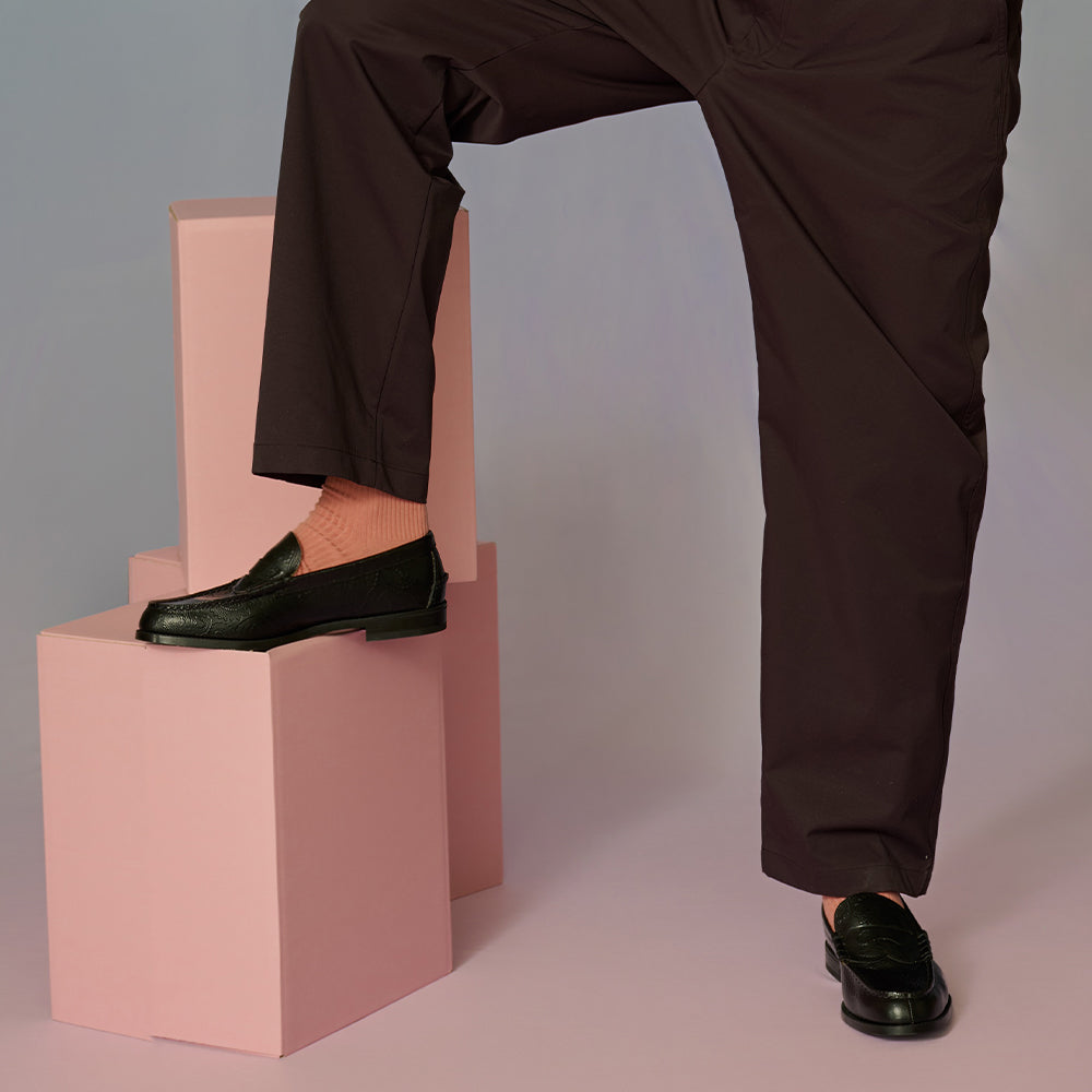 ローファーをベースに、履き心地を高めるためにあらゆるスペックをアップデート。足を通した瞬間に柔らかさを感じられるように、アッパーには新規開発した国産のソフトレザーを採用し、クッション性の高いスポンジを引いた中敷を搭載しました。