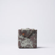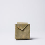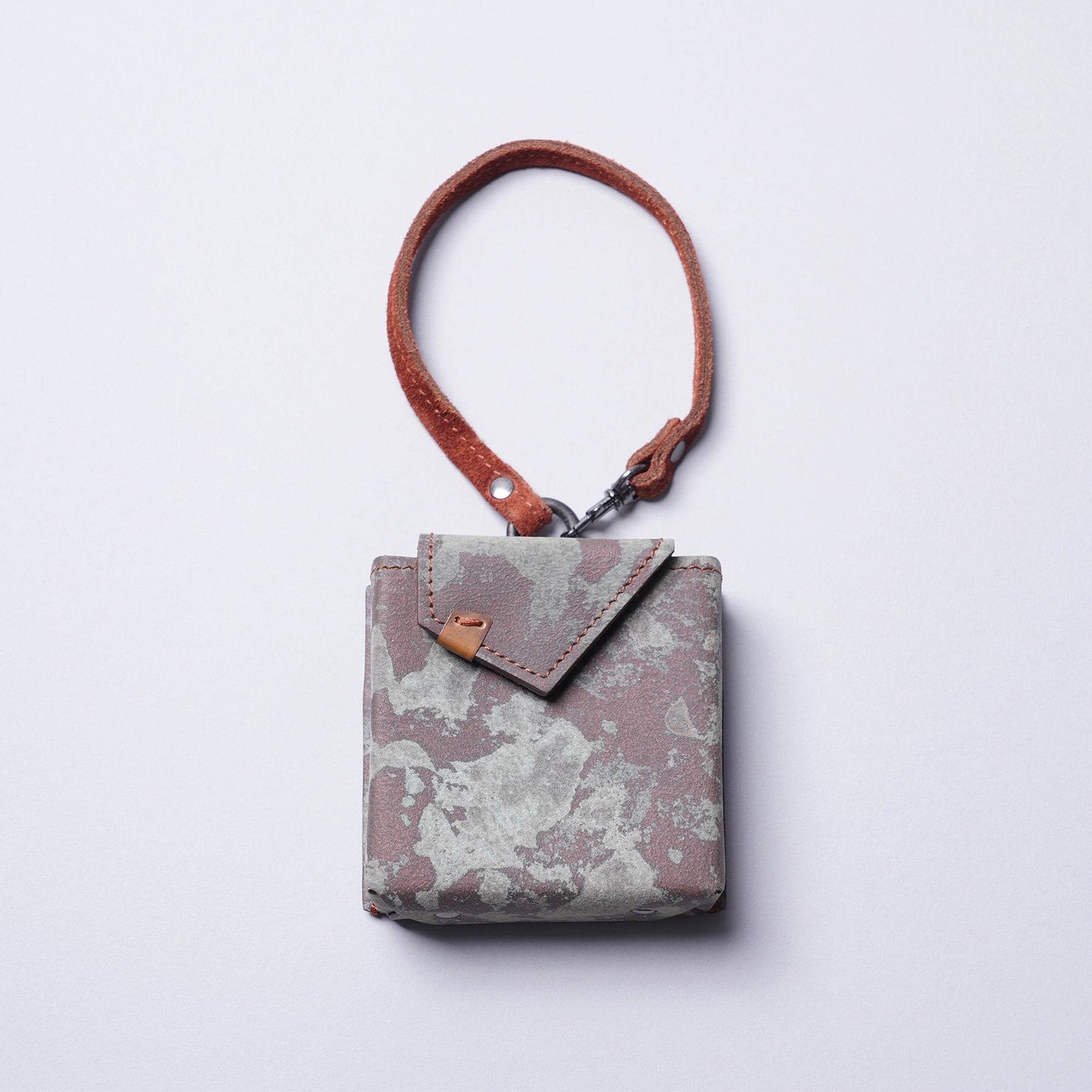 真鍮、赤銅などを吹き付け、錆を呼び起こした本革を使用。一枚、一枚革職人の経験と感性により生まれる、工芸品級の素材のガジェットケース。ワイヤレスイヤホンや、スマートキーなどの携帯に最適で、フック付きのストラップでバッグやベルトに通してアクセサリー感覚で使うこともできます。フラップには金属プレートが手縫いされ、keuの世界観を表すアクセントとなっています。付属の革紐は取り外し可能です。錆レザーの裏面には、ベロア革を使用。手触りがとても良く、各色に合わせた配色がマッチしています。仕立ては至ってシンプルに。されど精密にパターンを引き、意図するカタチを表現。直線的でありながら計算に基づく非対称なデザイン。自らが誰よりも虜になるシリーズです。