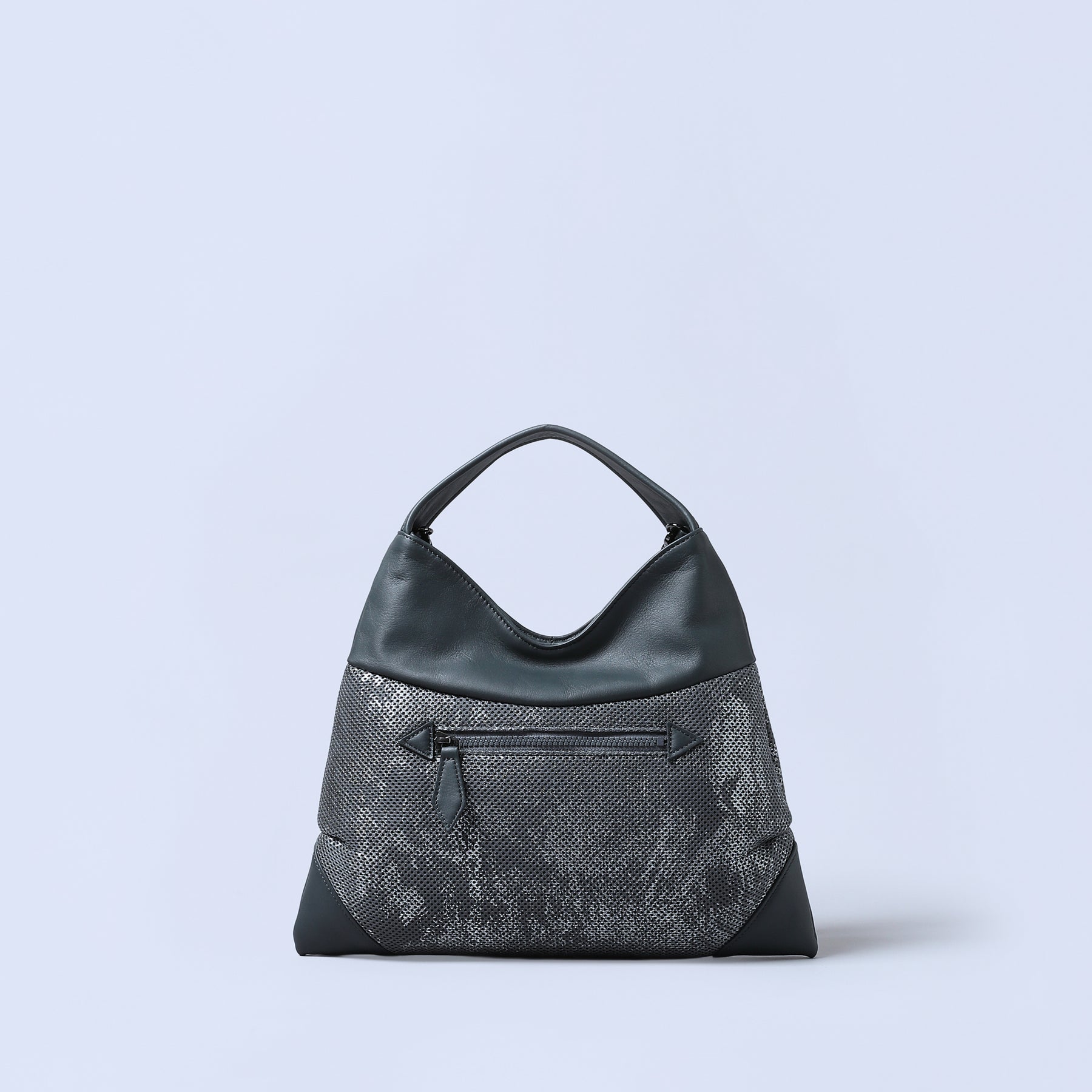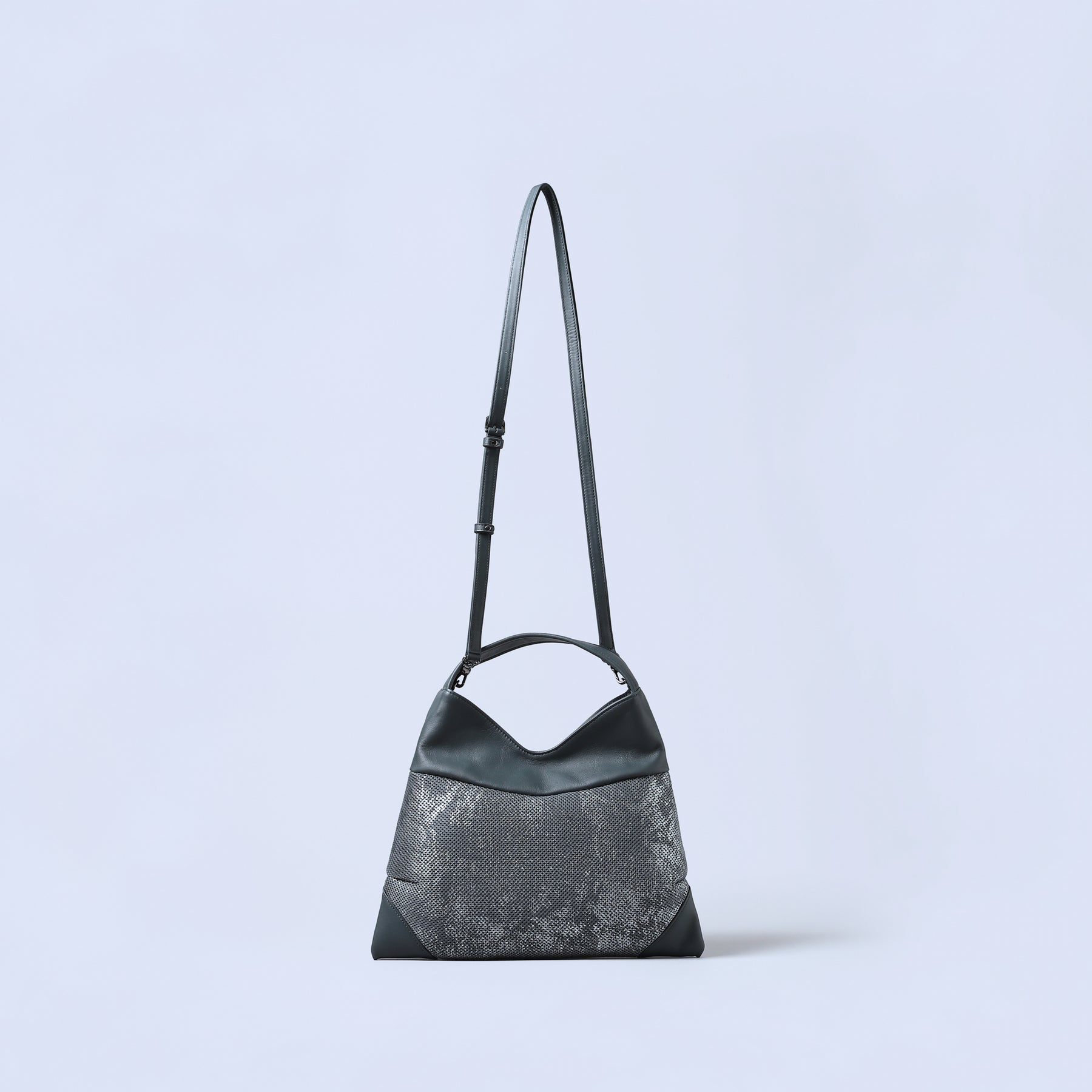 ファッションと親和性の高い軽量異素材コレクション。アートなメタリックのアブストラクト柄がモードな雰囲気。軽いラッセル生地とタッチ感の良いソフトな牛革を使用。ハンドルが心地良く手になじみ辛口モードを和らげる。実用性とファッション性を兼ね備えたバッグは、大人のデイリーパートナーにふさわしい。