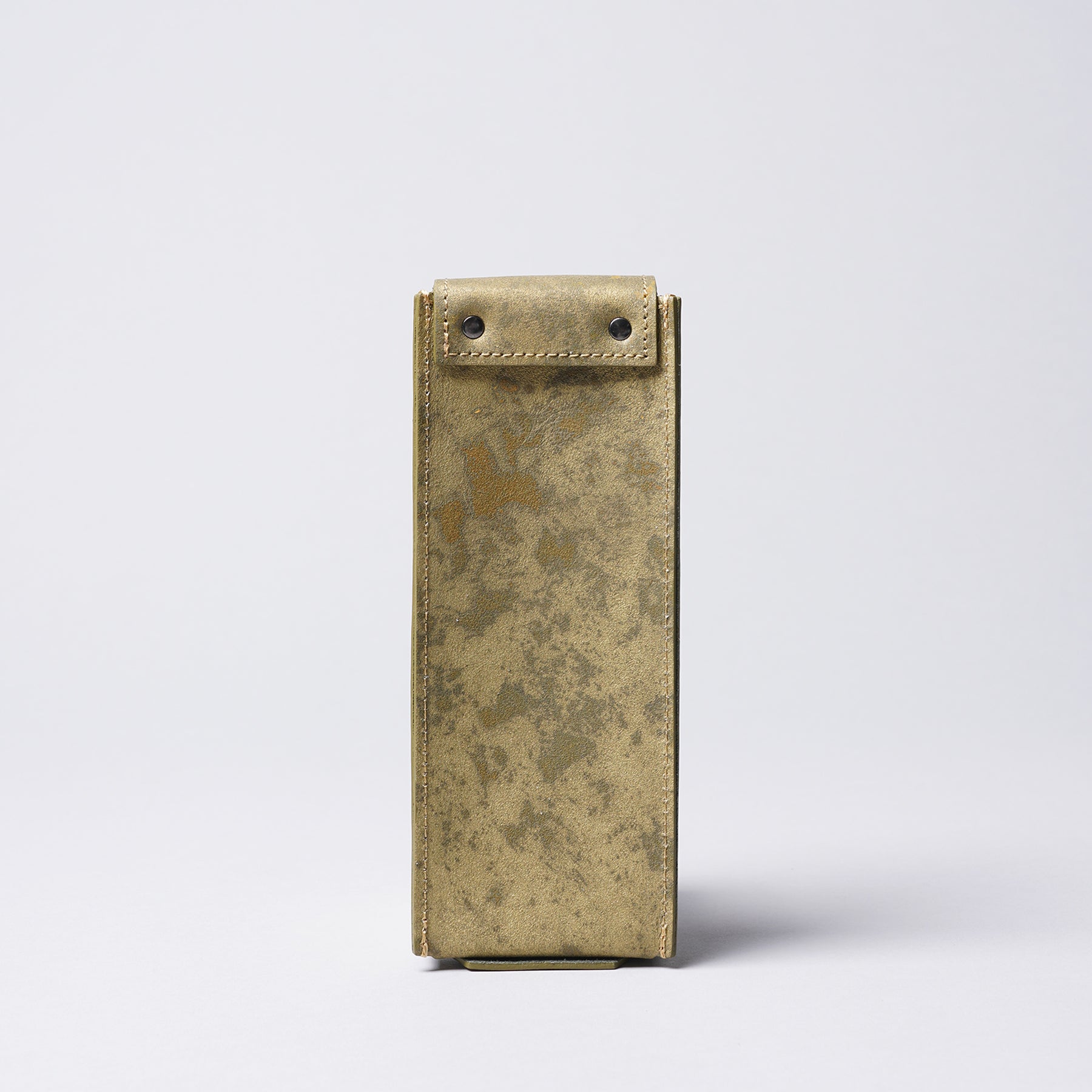 這款文具盒是採用黃銅鏽加工處理之皮革製成。此種材質乃由皮革職人依據積累經驗及感性將一片片皮革噴塗黃銅或紅銅,使之產生鏽化效果,既而精心製作成具有工藝品等級的皮革。這款商品非常適合在攜帶文具等物品時使用,可容納約三支筆。翻蓋上手縫的小巧金屬飾板,成為點綴keu品牌的專屬標記。整體造型雖呈現簡約,但在製作時卻精細地繪製版型,將想要呈現出的形狀完整展現。直線中經由細部計算呈現出非對稱設計感,是一款能讓人自我沉迷的系列。