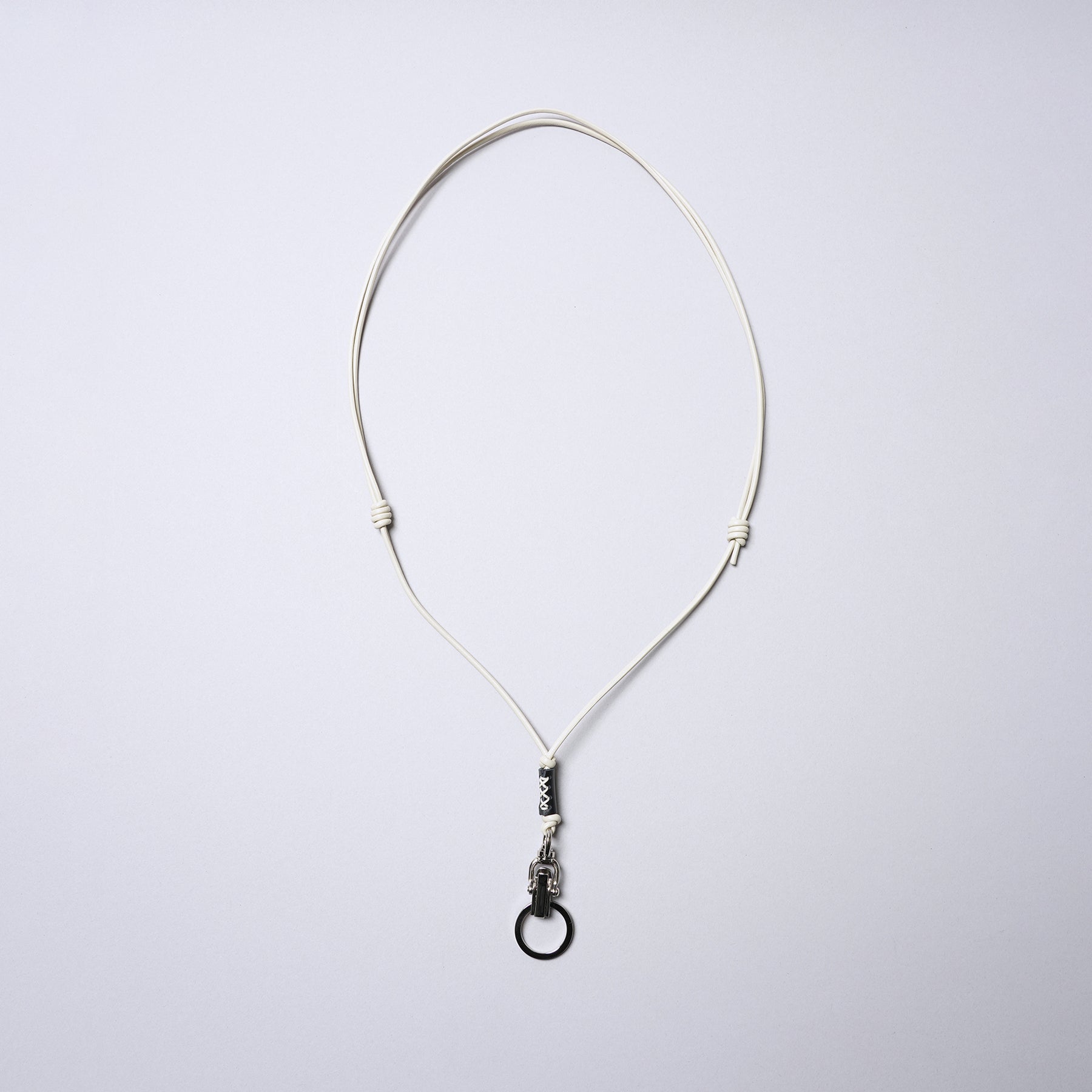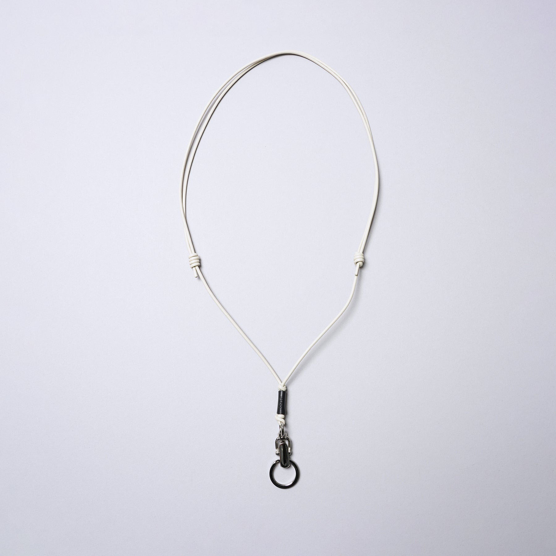 這款多功能頸掛繩選用夾式扣環並搭配雙環設計製作。可在裝置環扣狀能下作為眼鏡掛繩或鑰匙圈使用,也可拆下環扣作為智慧型手機掛繩或證件夾使用。於黑色皮革配件上飾以白色手工縫線,增添一抹精緻細節頸掛部分採用柔韌的皮革繩製作,並可透過滑動繩結打結處調整長度(可調整範圍約在80cm至最長150cm/也可斜背使用)