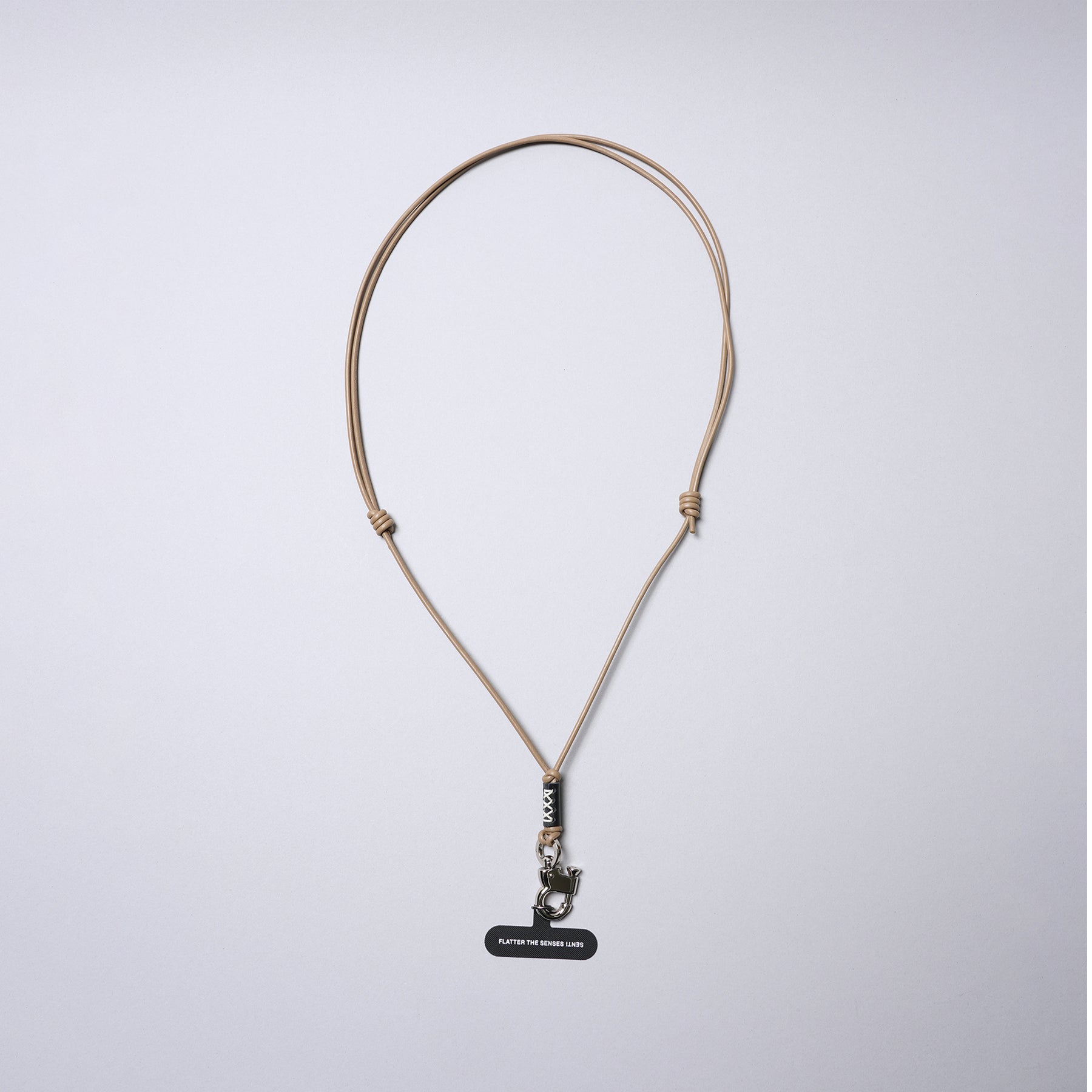 頸掛部分採用柔韌的皮革繩製作,並可透過滑動繩結打結處調整長度(可調整範圍約在80cm至最長150cm/也可斜背使用)。
