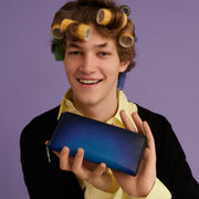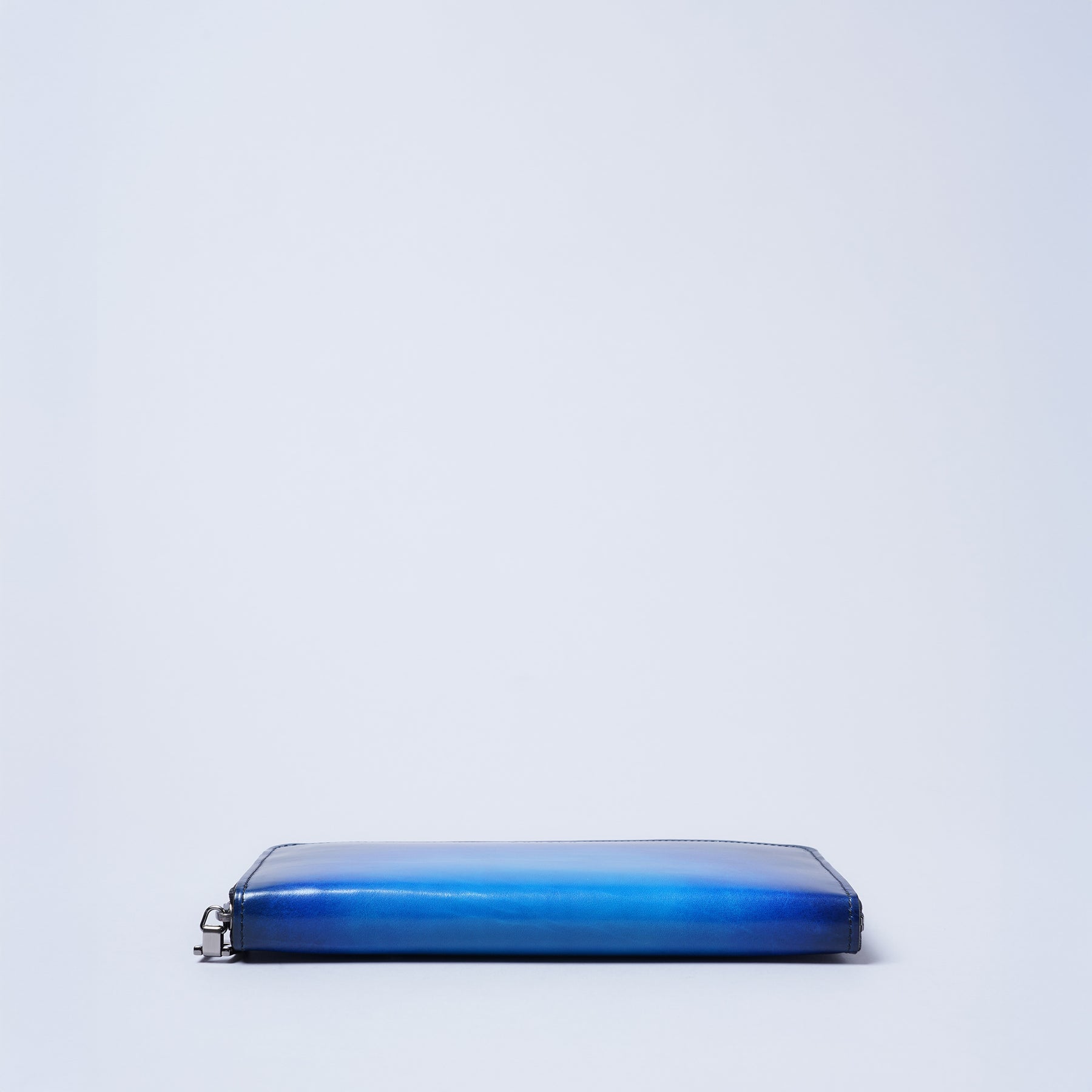 此款長夾來自Veratula系列,以繪畫技法為設計靈感。透過yuhaku品牌的獨家招牌染色技術,使皮革呈現出兼具透明感與深邃感的漸層美麗效果。在細緻的小牛皮上由yuhaku染色職人施予手染處理,使原本不透明的皮革呈現出極具透明度的漂亮光澤。這項由yuhaku獨創出的手染技藝源自繪畫技巧,也是全球罕見的稀有技術。